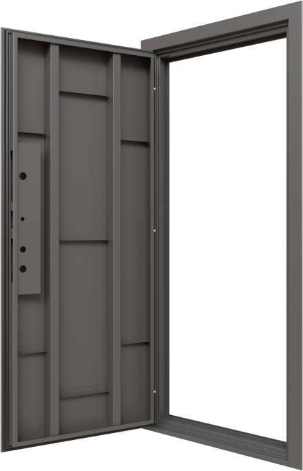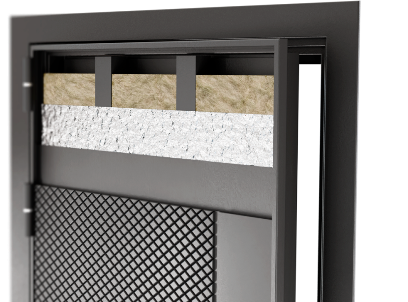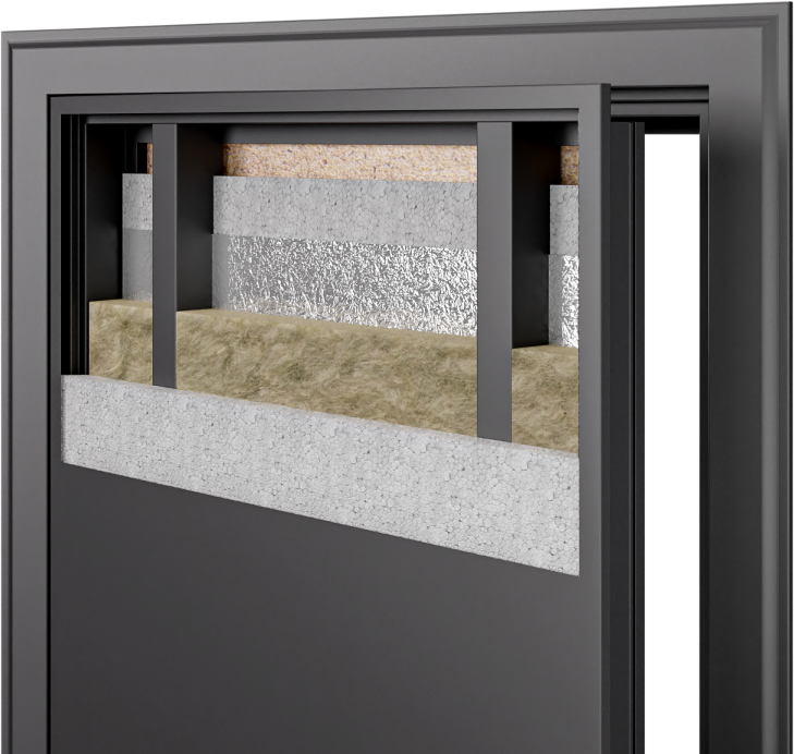 Конструкция двери основана на усиленном металлическом каркасе толщиной 115мм с вертикальными ребрами жесткости высотой 200мм, что обеспечивает исключительную прочность и устойчивость к взлому. Наполнение полотна выполнено из минеральной плиты высокой плотности, а короб утеплен минеральнойватой URSA, что гарантирует превосходные тепло- и шумоизоляционные характеристики. Такое техническое решение делает дверь идеальным барьером против холода, шума и нежелательного проникновения.