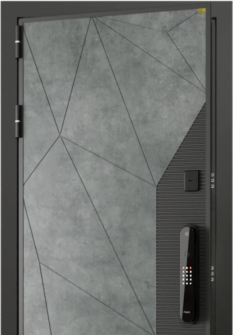 Внешний вид двери поражает элегантностью: снаружи применено порошково-полимерное покрытие цвета "Муар с блестками 9005" в сочетании с ламинированной МДФ панелью 12мм цвета "Сатин графит". Внутренняя сторона отделана ламинированной МДФ панелью 10мм цвета "Эмалит белый", что создает гармоничный контраст и подчеркивает современный стиль интерьера. Три контура уплотнения (два D-образных и один магнитный) обеспечивают герметичность и энергоэффективность.